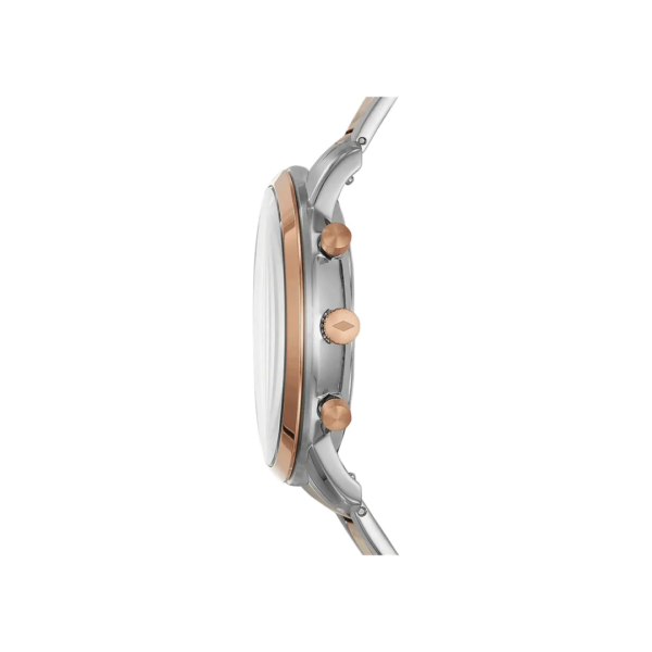At the heart of the watch is its White Multi-Layer Chronograph Dial, crafted with clean hour markers, bold hands, and well-structured chronograph sub-dials. The bright white background offers excellent readability, while the two-tone accents enhance its luxury appeal. This classic-yet-modern dial design ensures the watch stands out while maintaining Fossil’s signature minimal charm.