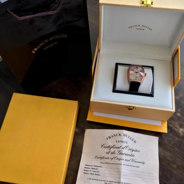 The signature Franck Muller Tonneau Case in rosegold enhances structure, comfort, and prestige. Its curved ergonomic design ensures the watch sits perfectly on the wrist while offering unmatched visual appeal. The bold silhouette has become a global symbol of high-end watchmaking.