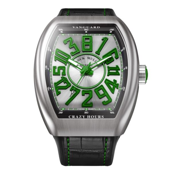 Franck Muller Vanguard firstcopy Crazy Hours Green Swiss ETA V45CHBR Automatic Men’s Watch The Franck Muller Vanguard firstcopy Crazy Hours Green Swiss ETA V45CHBR Automatic Men’s Watch brings together one of the most iconic complications in haute horology with the bold, modern architecture of the Vanguard collection. Designed for men who appreciate true luxury styling, unique mechanical personality, and unmistakable wrist presence, this model stands out with its striking green colorway and the legendary “Crazy Hours” jumping-hour mechanism that has made Franck Muller a world-renowned name.