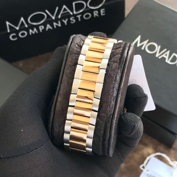 The Two Tone Stainless Steel Case elevates the watch’s presence with a blend of silver and gold finishing. This dual-tone look adds richness and luxury, making the watch suitable for both professional and casual styling. The brushed and polished contrast creates visual depth, while the solid case structure ensures durability and strong wrist presence. Movado’s smooth rounded lines and premium craftsmanship are clearly reflected in this design.