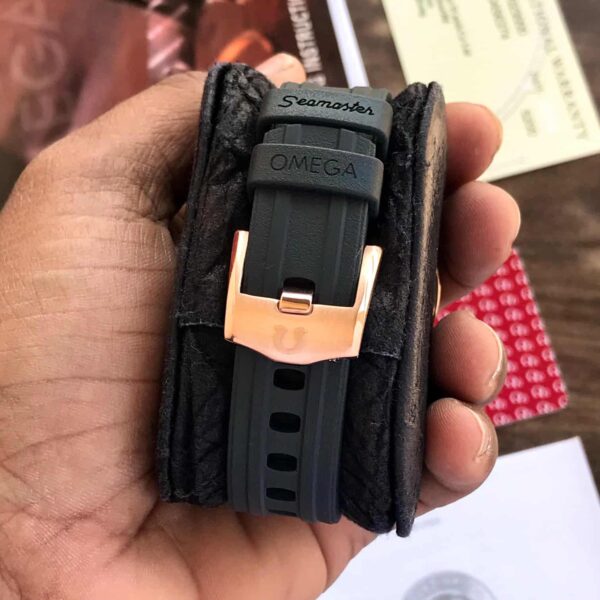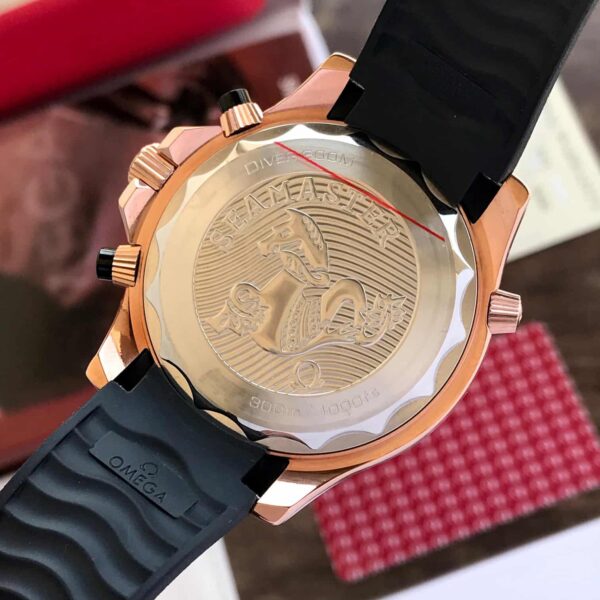 At the core of the watch is its Professional Black Chronograph Dial, designed with polished hour markers, luminous hands, and clearly defined sub-dials. These sub-dials allow easy tracking of elapsed time, adding both function and visual depth to the dial. The black base enhances contrast, ensuring excellent readability whether worn under bright sunlight or in low-light environments. Depending on the variant, the dial may include wave-pattern detailing inspired by the Seamaster’s signature styling.