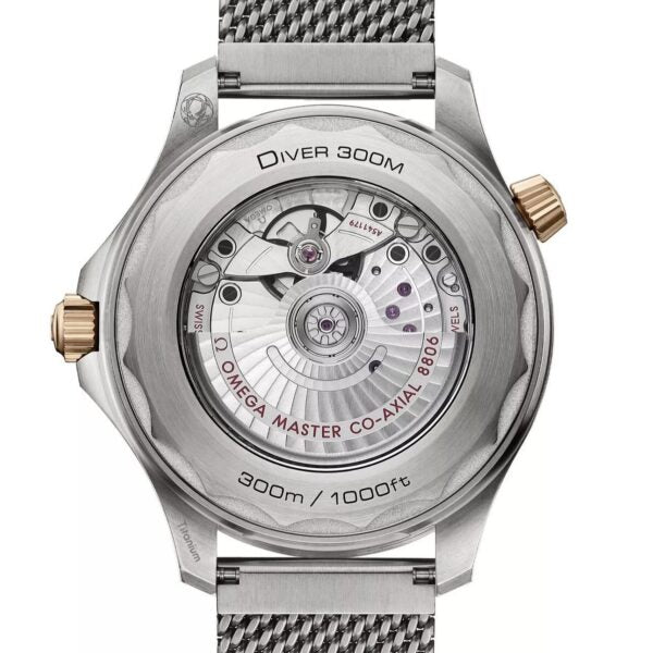 The watch features a Bronze Gold–Inspired Case, known for its unique tone that deepens with age, creating a natural patina over time. The warm metallic color offers a refined yet bold appearance, setting it apart from traditional stainless steel or full-gold watches. The case is shaped in classic Seamaster form—sharp contours, polished edges, and a masculine profile designed for versatile daily wear.