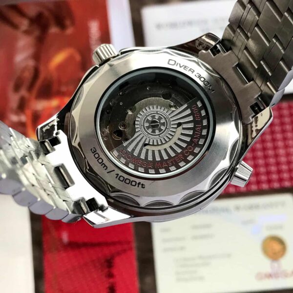 At the heart of the watch is its Striking Green Dial, featuring polished indices, luminous hands, and a detailed finish that shifts beautifully under light. Depending on the variant, the dial may include Omega’s signature wave pattern or a smooth matte/sunburst green tone. The clean layout ensures excellent readability, while the deep green color adds a unique luxury character rarely seen in diver watches.