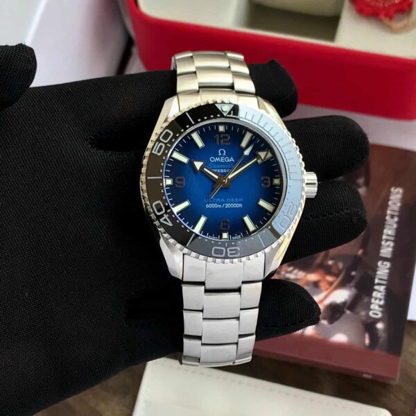 This Omega Speedmaster Ultradeep firstcopy Japanese Automatic model is perfect for men who appreciate modern luxury, ocean-inspired styling, and dependable mechanical performance. It combines the classic Omega design language with a bold silver-blue colorway that stands out on the wrist.