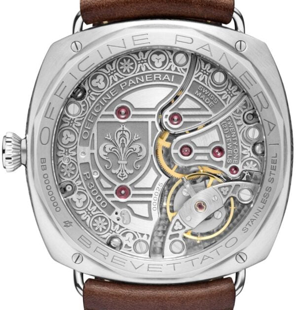 The Radiomir Wire-Lug Case is one of the most distinctive features of this timepiece. Unlike the Luminor’s crown guard and cushion case, the Radiomir features elegant wire lugs, a polished surface, and a rounded vintage silhouette that delivers exceptional comfort on the wrist. What sets the Firenze edition apart is its floral hand-engraving motif—a tribute to Italian Renaissance artistry and Florence’s architectural heritage (engraving style varies by edition). This premium firstcopy captures the beauty of these engraved patterns, giving the watch an artisanal and collector-grade appearance.