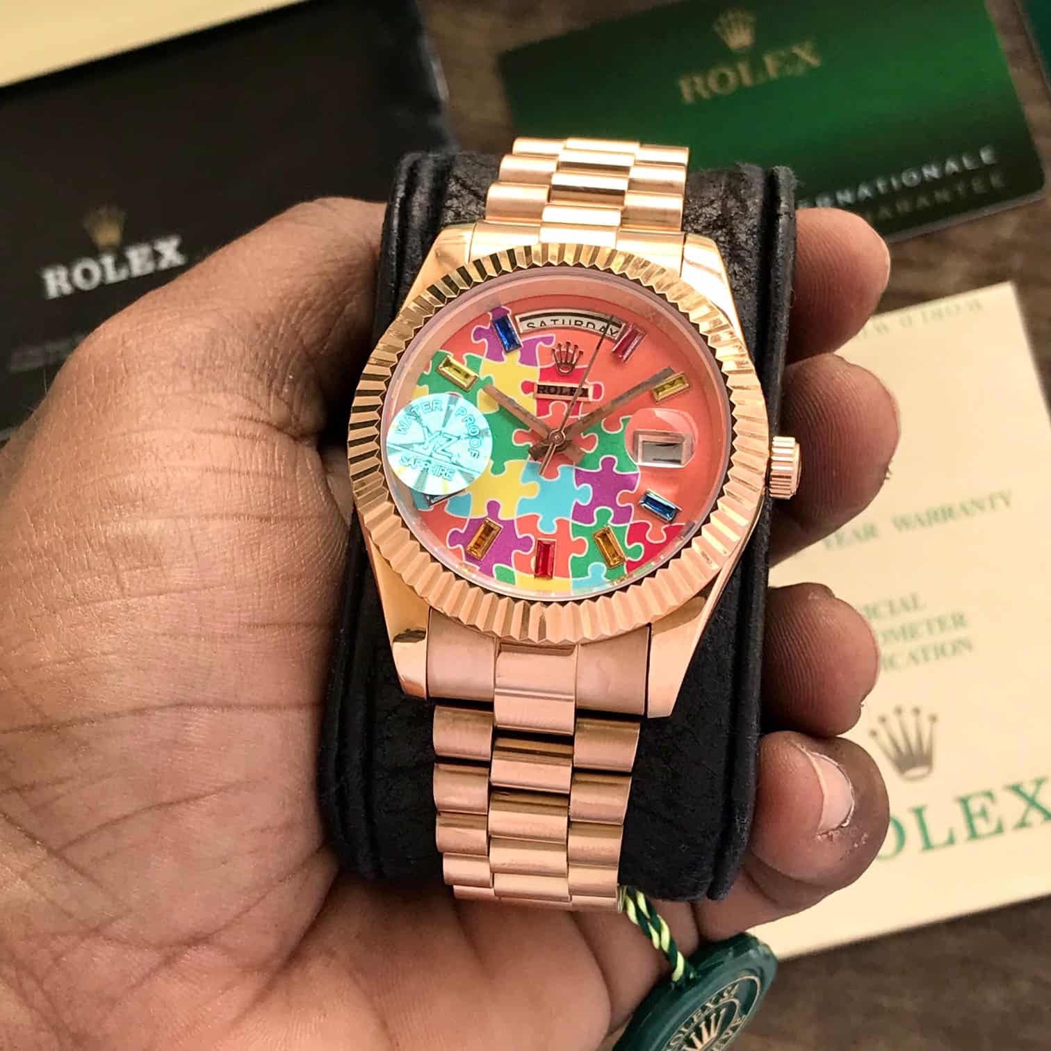 Rolex Day Date Puzzle Dial Swiss Automatic Mens Watch firstcopy The Rolex Day Date Puzzle Dial Swiss Automatic Men’s firstcopy watch is one of the most eye-catching, artistic, and conversation-starting luxury-inspired models available today. Celebrated for its bold multi-color puzzle-themed dial and premium Swiss-inspired mechanics, this masterpiece showcases creativity, individuality, and refined craftsmanship. The Rolex Day-Date series—known globally as the “President’s Watch”—has always symbolized excellence and prestige. This vibrant puzzle-dial edition brings a modern, artistic twist to that iconic heritage. Crafted with exceptional detail and master-quality finishing, this Rolex Day Date men’s clone watch makes a unique, sophisticated, and fashionable statement on the wrist.